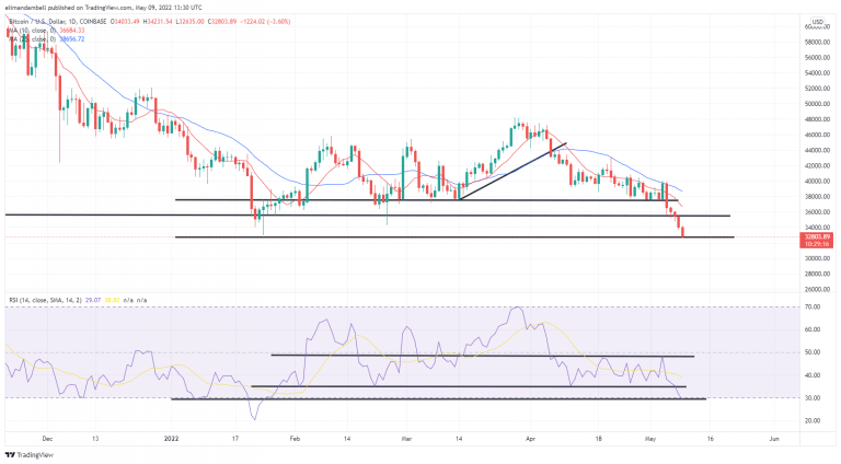 Following five consecutive days of declines, BTC/USD dropped to an intraday low of $32,813.31 on Monday.