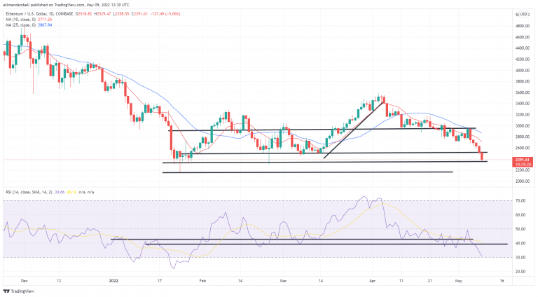 Today’s declines saw the world’s second-largest cryptocurrency drop to a bottom of $2,374.30, which is its lowest point since February 28.